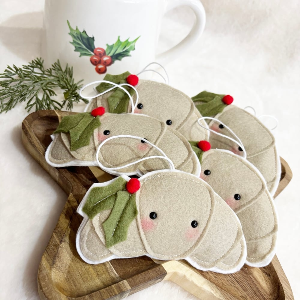 Perfect for Christmas my felt croissant decoration has been given a festive twist with a sprig of holly to decorate it