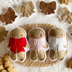 Pretty garland of 6 felt bows in gingerbread colours to match the collection decorations. Added onto embroidery thread so it can be hung up anywhere