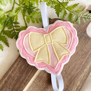 Pretty scallop edged hearts in two shades of felt finished with a felt bow and backed in thick white felt