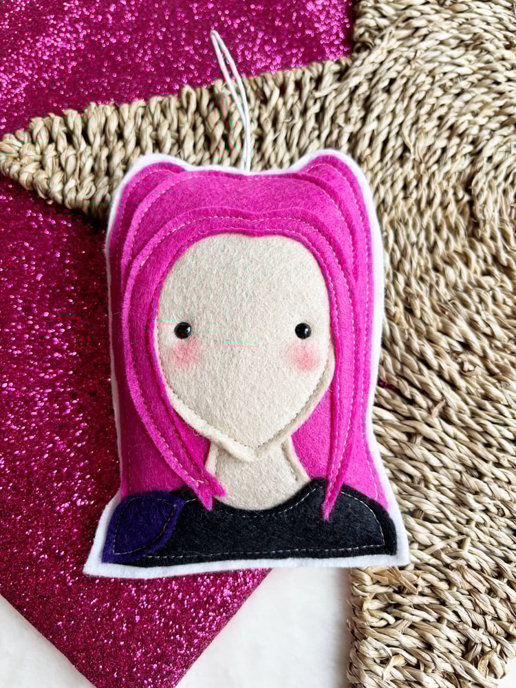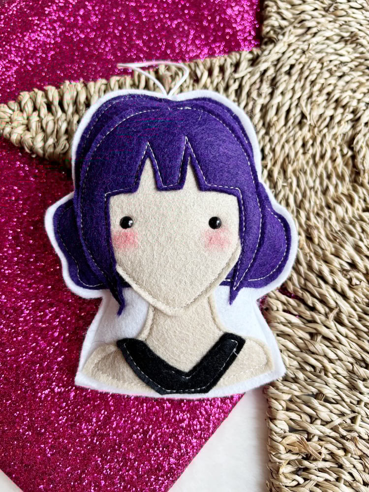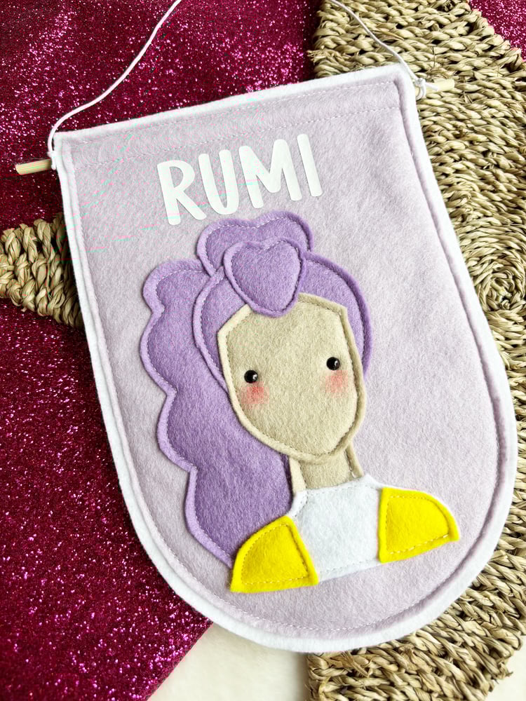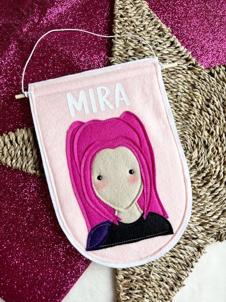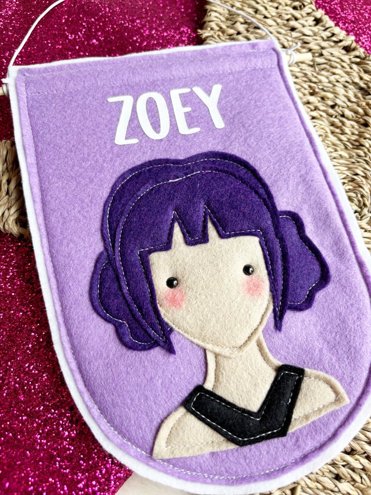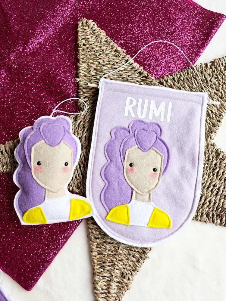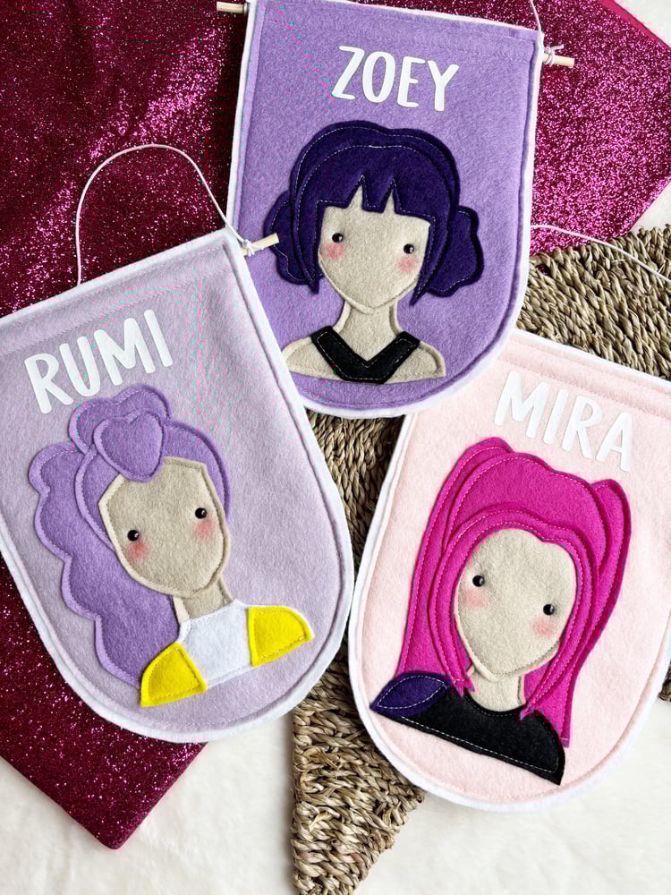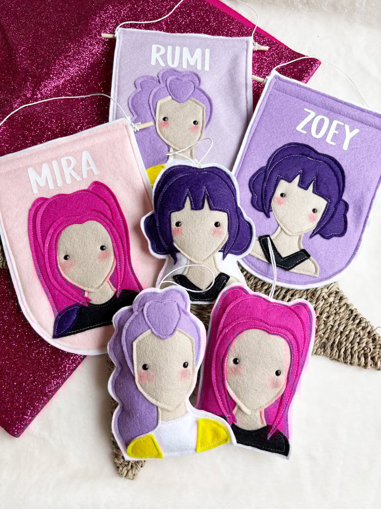 These handmade felt decorations and banners are inspired by the vibrant style of K-pop demon hunters. Each piece features an adorable character portrait with bold, colorful hair and sweet details like rosy cheeks and handcut accents. Perfect as wall hangings, bedroom decor, or thoughtful gifts for fans of unique handmade items.