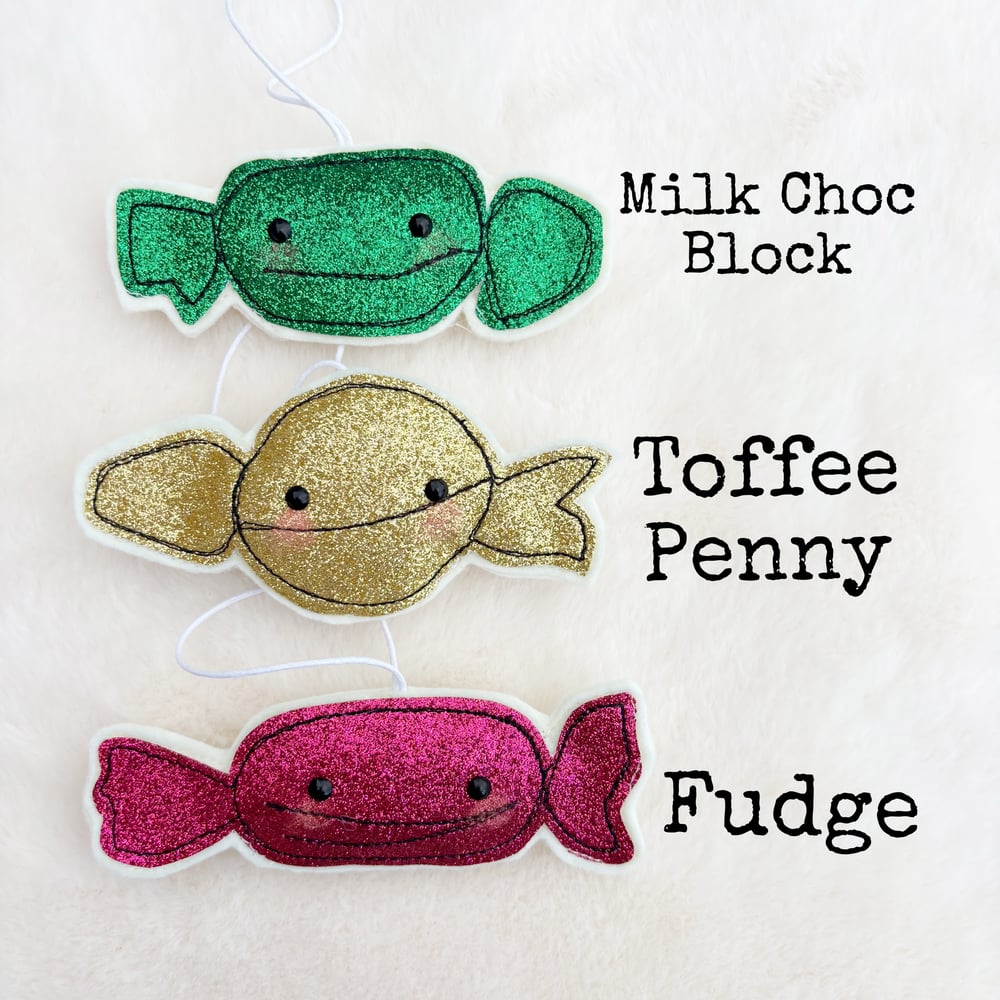• Set of multicoloured glitter decorations inspired by Quality Street chocolates- sold individually or as a full set of 11 at a reduced price!