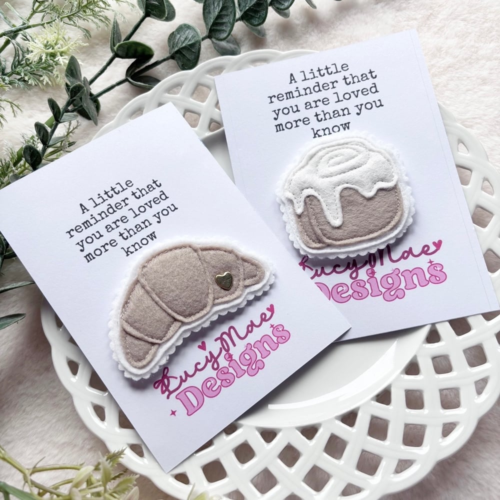 Each piece features an adorable bakery-inspired design—a cozy croissant or a sweet cinnamon roll—attached to a card with the message: